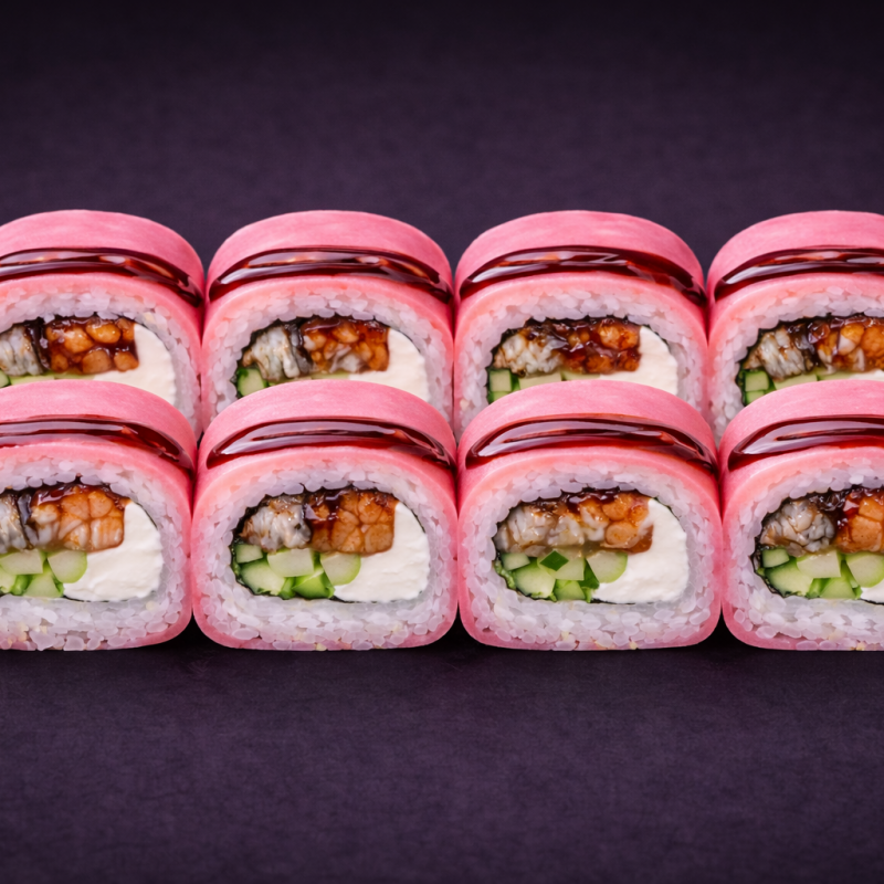 Ryż, papier sojowy, nori, serek, węgorz, ogórek, sos unagi
