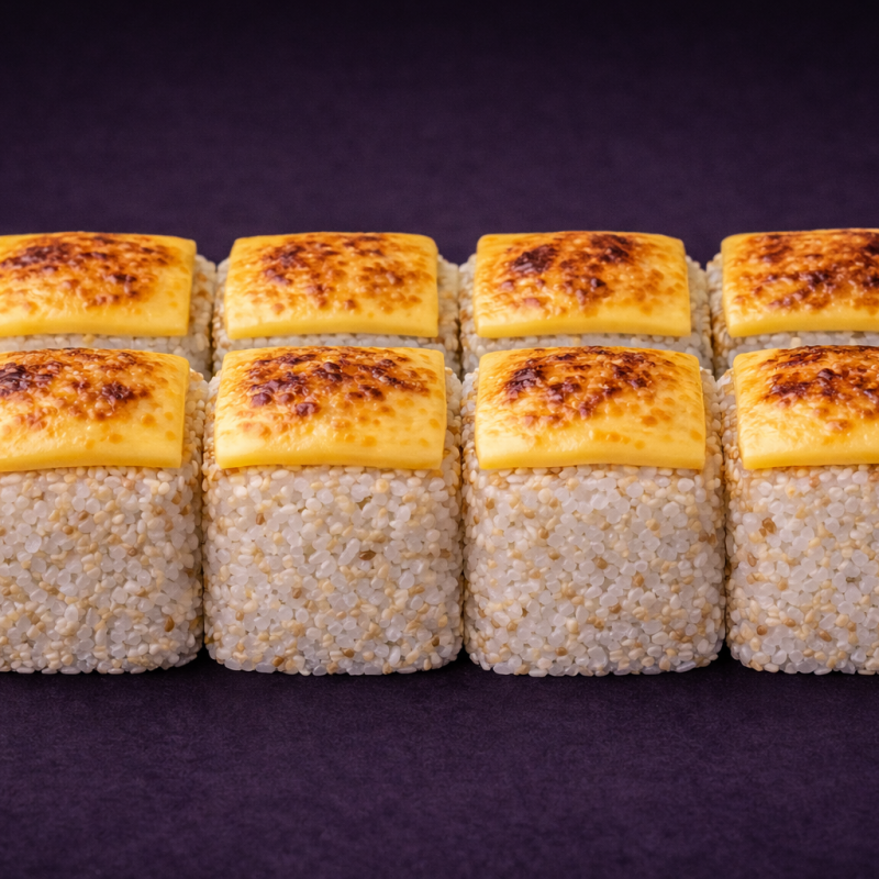 Ryż, nori, serek, ser żółty, łosoś, ogórek, majonez japoński, sos teriyaki, sezam